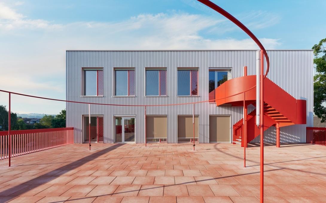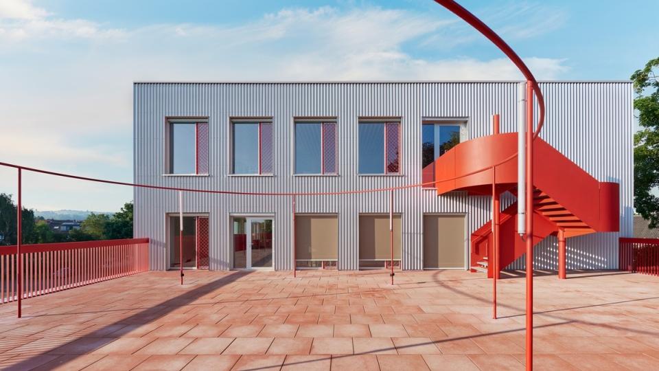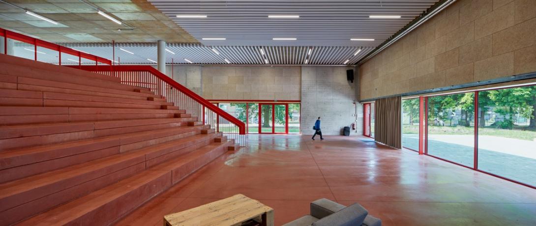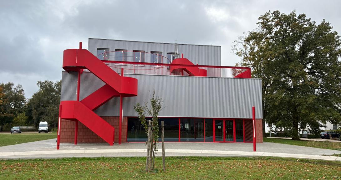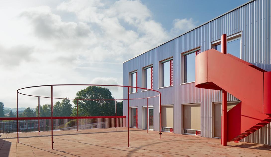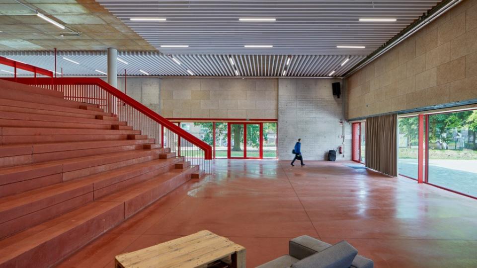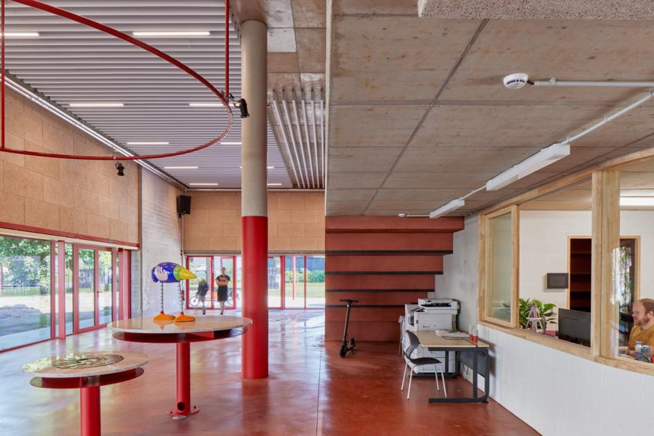 Het gebouw is dan ook nauw verbonden met de schoolvisie. “In de leerplateaus werken de kinderen op eigen tempo aan projecten, die driejaarlijks aan het publiek kunnen worden voorgesteld aan de tribune op het gelijkvloers. Door de openheid – zelfs de lerarenkamer heeft geen wanden – hebben we in dit gebouw meer wc’s dan afgesloten ruimtes. De cirkel staat centraal, als symbool van onze holistische onderwijsbenadering. De leerlingen komen via de opvallende, rode buitentrappen direct op hun plek zonder de ‘flow’ van werktijden te verstoren. Dat kleurgebruik is geen knipoog naar de rode balpen van de leerkracht, maar een hommage aan Hans Vangelder én symbool van het geloof dat elke leerling met genoeg steun altijd opnieuw kan schitteren, ook na een moeilijke periode.”