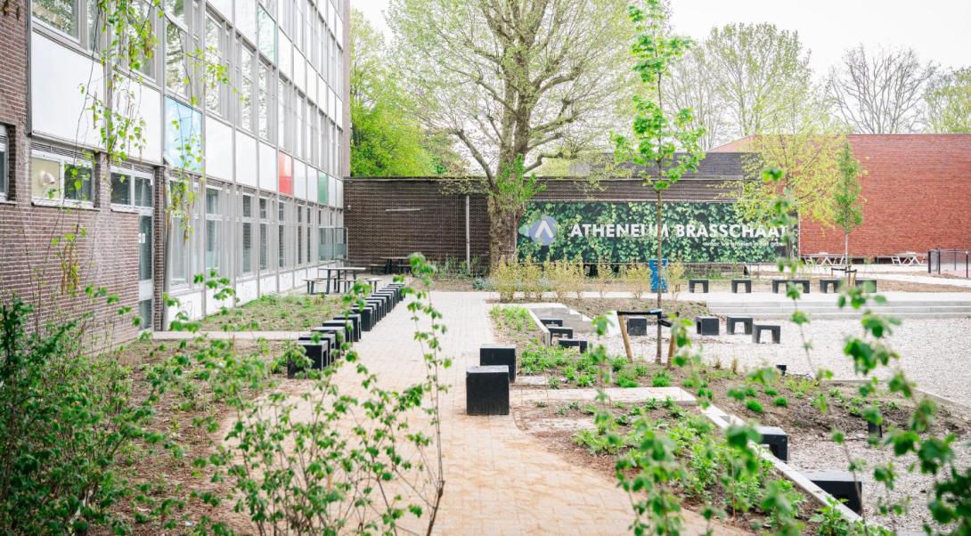 Op Atheneum Brasschaat werd de voorbije jaren intens gewerkt aan de omvorming van een grotendeels verharde speelplaats naar een ‘Groene Oase op School’ (*). Met maar liefst 1.303 m² ontharding en de aanplant van honderden inheemse struiken, planten en bomen kreeg de schoolomgeving een volledig nieuw karakter. Leerlingen kunnen er vandaag genieten van rustige zithoeken, hangmatten, een zitput en picknickbanken, omringd door acht inheemse bomen en meer dan 1.000 planten.