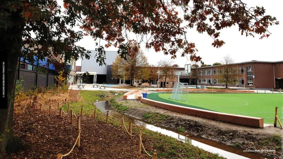 Dat vergroenen niet beperkt blijft tot basisscholen, bewijst het Sint-Pietersinstituut in Turnhout. Op de vroegere kale vlakte kwam een verfijnd landschap van wadi’s, struiken en inheemse bomen. Drie regenputten van telkens 100.000 liter zorgen ervoor dat geen druppel verloren gaat – water wordt hergebruikt voor sanitair of geïnfiltreerd via de bodem.