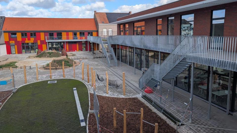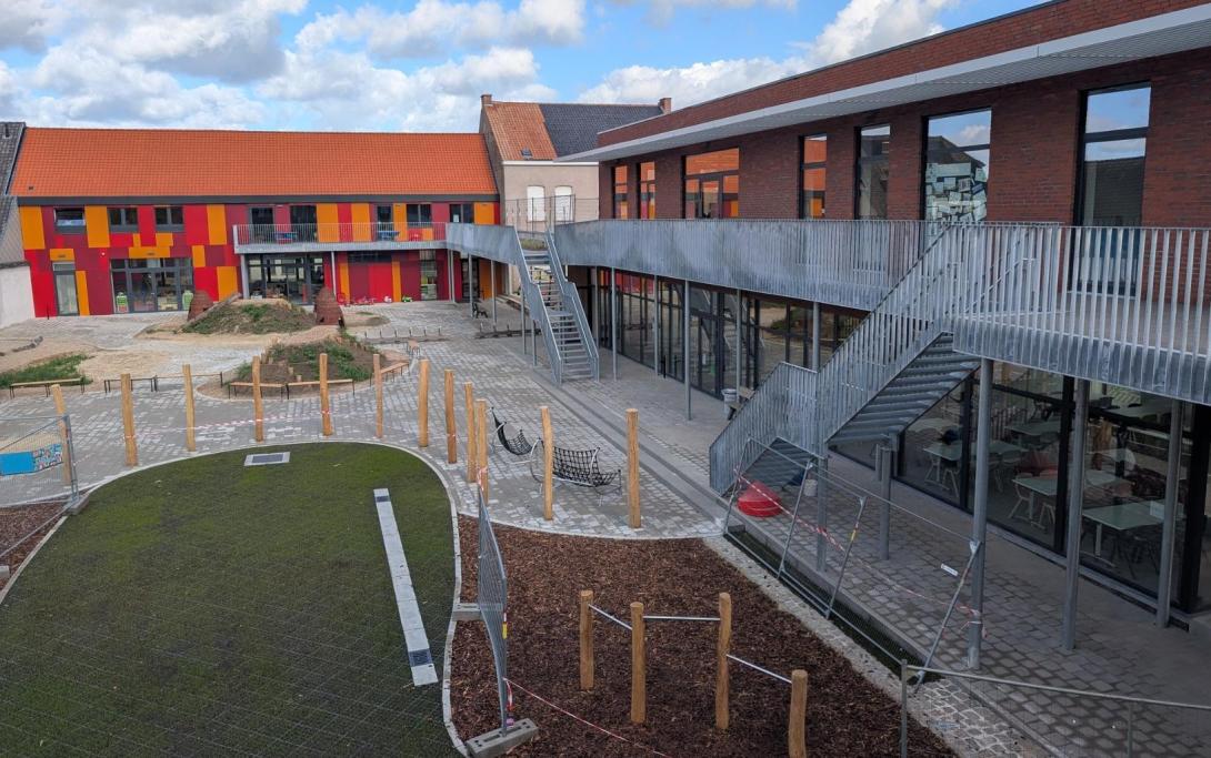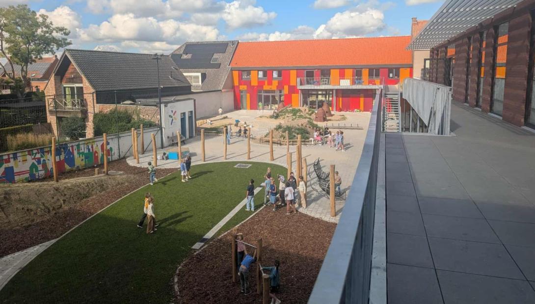 De heraanleg van de speelplaats vormt een volwaardig onderdeel van het project. De voormalige verharde vlakte werd getransformeerd tot een klimaatrobuust buitenleerlandschap waarin infiltratiezones, groenstructuren en speelnatuur centraal staan. Door selectief te ontharden en regenwater lokaal te bufferen en infiltreren, wordt het waterbeheer verbeterd en het microklimaat versterkt. De buitenruimte fungeert niet langer als louter recreatieve zone, maar als pedagogisch verlengstuk van het gebouw. De landschappelijke ingrepen dragen bij aan biodiversiteit, schaduwvorming en thermisch comfort en versterken de relatie tussen binnen en buiten.