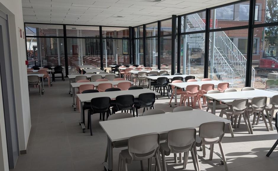 Centraal in de herstructurering staat een nieuw scharniervolume dat de relatie tussen straat, klasvleugels en speelplaats herdefinieert. Dit volume centraliseert de collectieve functies en fungeert als ruimtelijke spil van de campus. Het omvat de refter en polyvalente ruimte, klaslokalen voor het vijfde en zesde leerjaar en de lerarenkamer. Tussen de bovenbouwklassen werd een flexibele tussenruimte geïntegreerd die inzetbaar is voor co-teaching en gedifferentieerd werken, waardoor een open leerlandschap ontstaat.