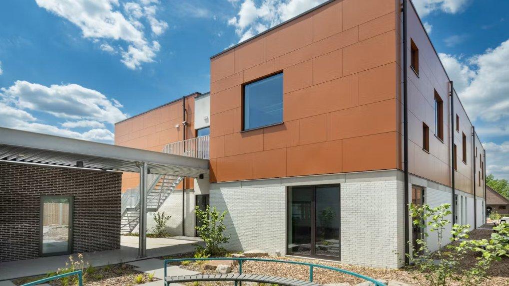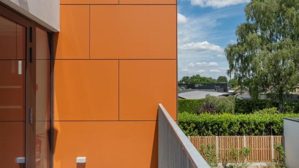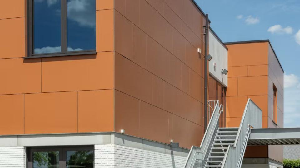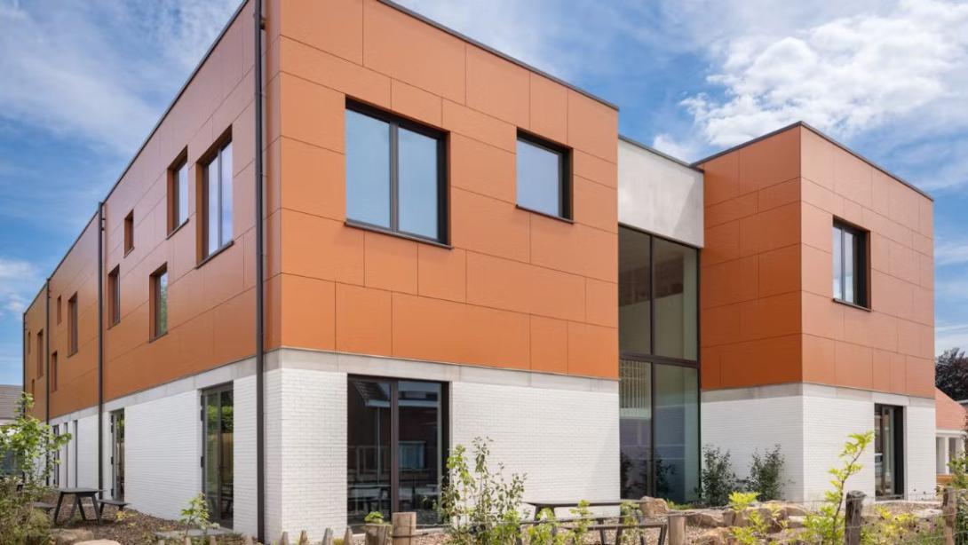 De nieuwbouw sluit visueel aan bij de gerenoveerde gebouwen. De gevel van de benedenverdieping bestaat uit witte bakstenen, gecombineerd met oranje panelen op de bovenverdieping. Deze panelen voldoen aan de brandveiligheidseisen voor scholen en zorgen voor een duurzame en veilige afwerking van de gevel.