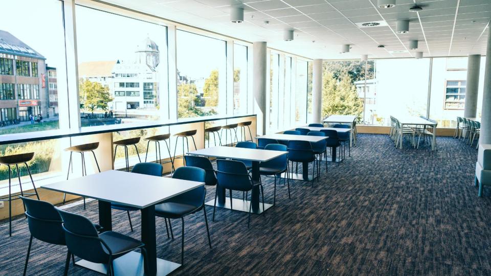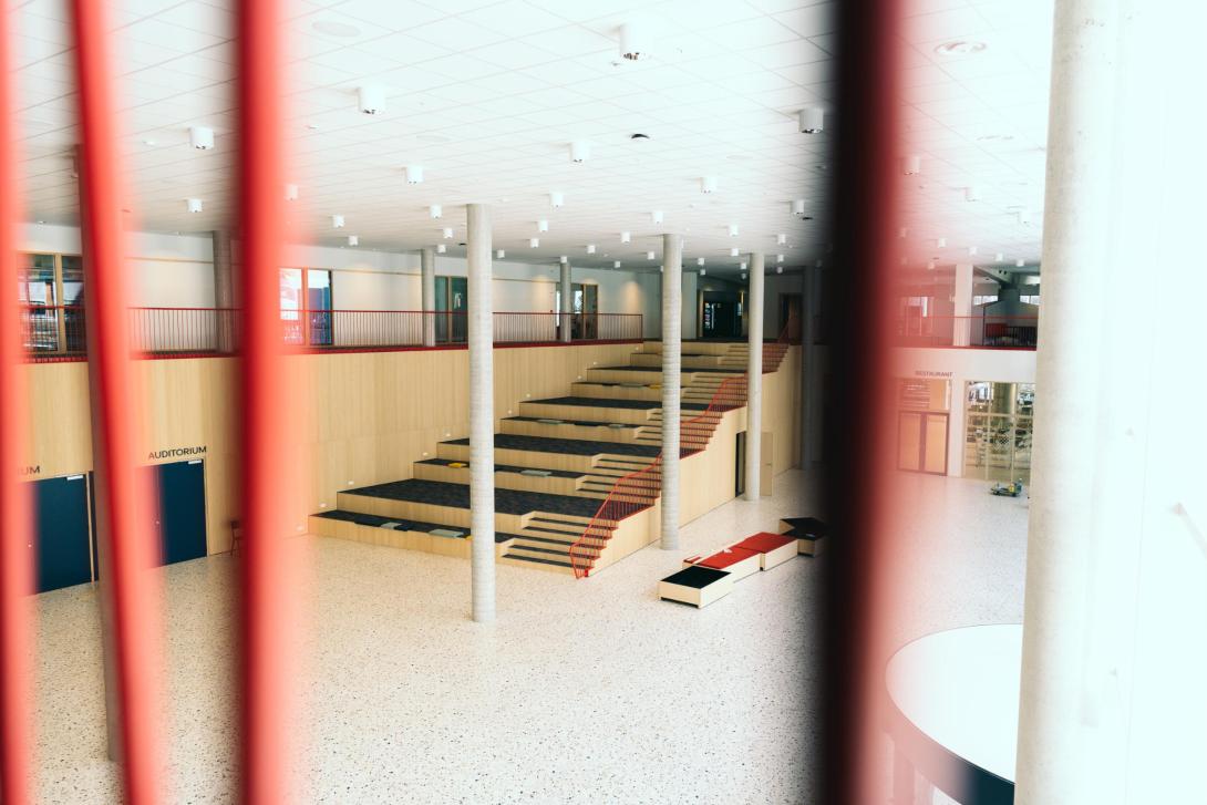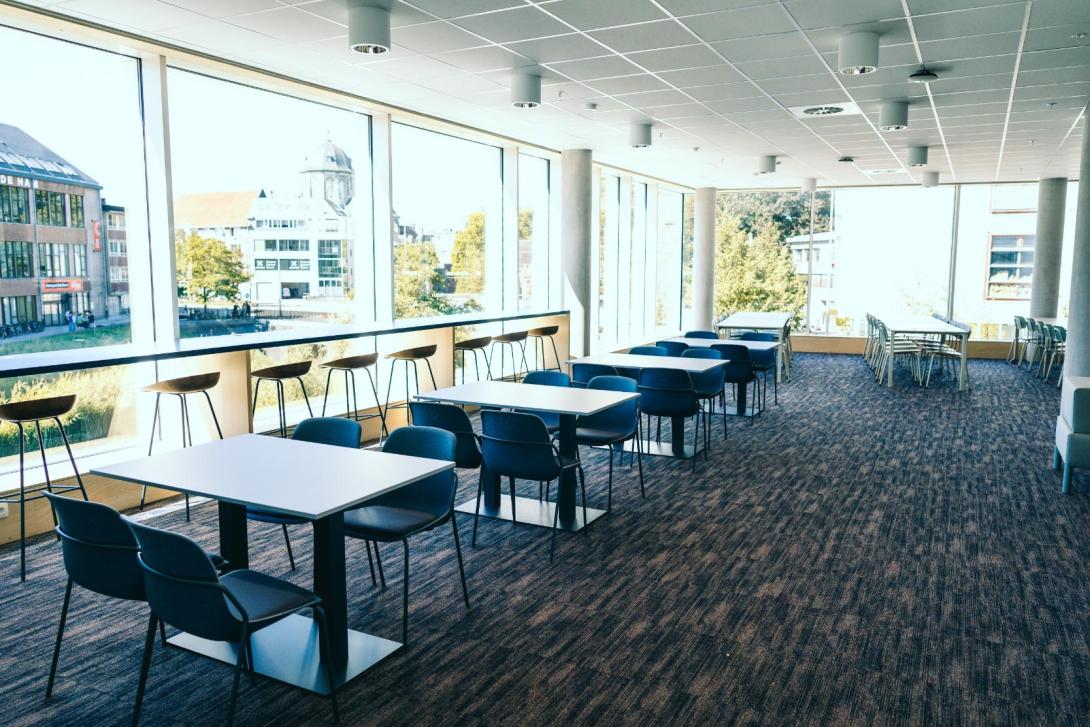 Het studentenrestaurant is dagelijks geopend en biedt warme en koude maaltijden, maar is tegelijk ontworpen als social hub die kan schakelen tussen refter, werkplek en foyer; strategisch gepositioneerd tussen leercentrum en grote aula zorgt het voor dubbelgebruik bij lezingen, proclamaties en events. De campus beschikt verder over een grote aula voor circa 450 personen, elf flexibele leslokalen, hybride lokalen voor online en fysieke lessen, projectlokalen en een volwaardig VR‑lokaal voor experimenten met virtual reality en simulaties.