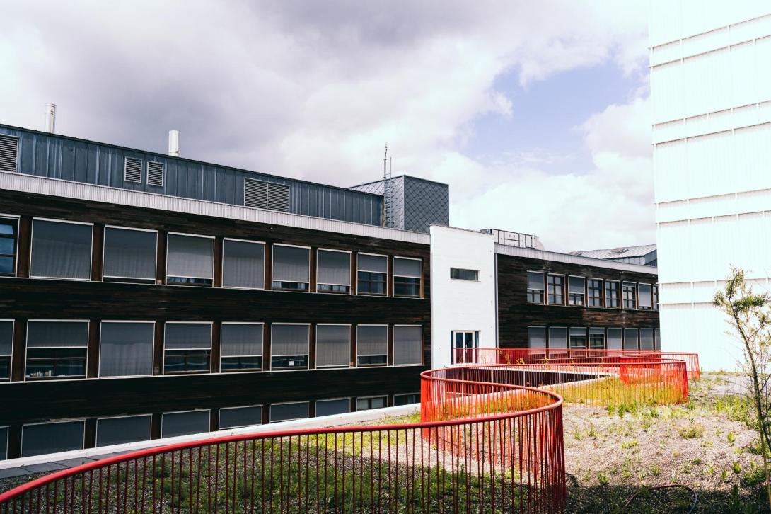 Langs de Dijle ontstaat daardoor een duidelijk tweedelig volume: twee massieve torens met circulatiekernen en secundaire functies flankeren een open gordijngevel in natuurkleurig geanodiseerd aluminium, die de transparante leer- en verblijfsruimtes als lichte schil naar het water toe presenteert. De gevels zijn opgevat als modulair gevelelementen-systeem met variërende perforatiegraad per oriëntatie; drievoudige beglazing en matte structuurbeglazing balanceren energetische performantie, daglichtinval en beperking van directe zoninstraling.