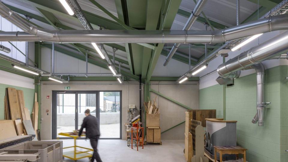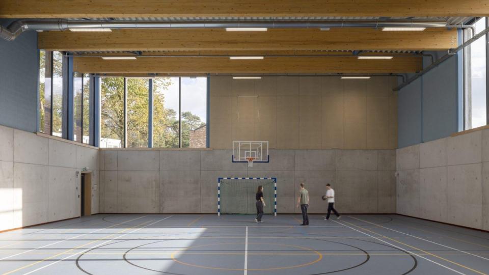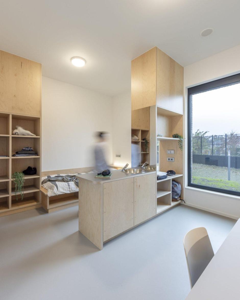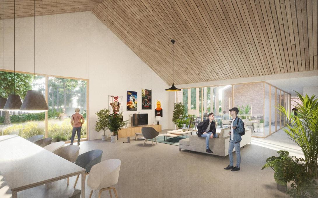 Binnenin staan daglicht, zicht op groen en overzichtelijke circulatie centraal. In het woongebouw beschikt elke jongere over een eigen kamer met ruimte voor persoonlijke inrichting, wat autonomie en eigenheid ondersteunt binnen een beveiligde context. Ruime leefruimtes met grote glaspartijen leggen een directe relatie met het landschap en het campusplein. In het praktijk- en onderwijsgebouw zijn ateliers en lokalen zo georiënteerd dat daglicht en doorzichten naar buiten vrijwel overal aanwezig zijn. De sporthal is compact georganiseerd, waardoor verplaatsingen kort blijven en begeleiders met duidelijke zichtlijnen kunnen werken.