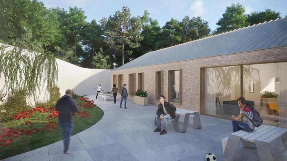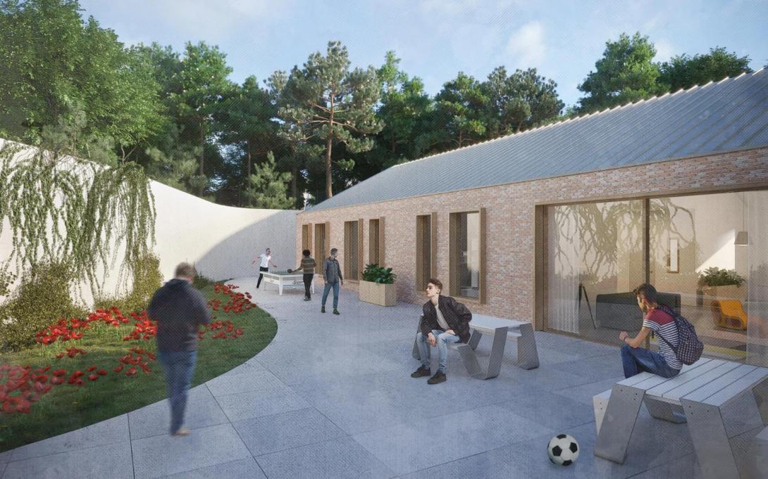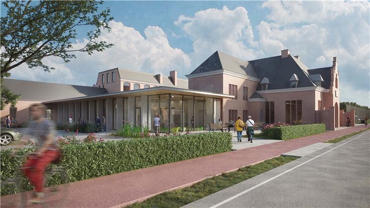 Centraal in de vernieuwing staan een sporthal, een praktijk- en onderwijsgebouw en kleinschalige woongebouwen voor langverblijf en een begeleidingsleefgroep. Samen vormen ze een compact ensemble rond een groot groen campusplein dat fungeert als ruimtelijk en sociaal zwaartepunt. Het ontwerpteam – Gortemaker Algra Feenstra, Licence to Build en Groep Infrabo – kiest voor een helder leesbare structuur waarin publieke, semipublieke en besloten zones logisch op elkaar aansluiten. Historische hoofdgebouwen worden gerenoveerd en herbestemd tot administratieve ruggengraat met een nieuw onthaal aan de straatzijde, terwijl de nieuwbouwvolumes zich als herkenbare objecten in het groen rond het plein positioneren.