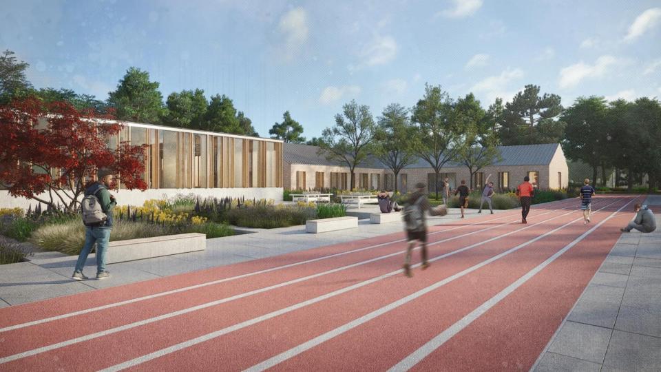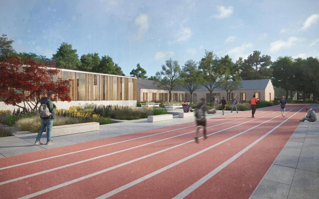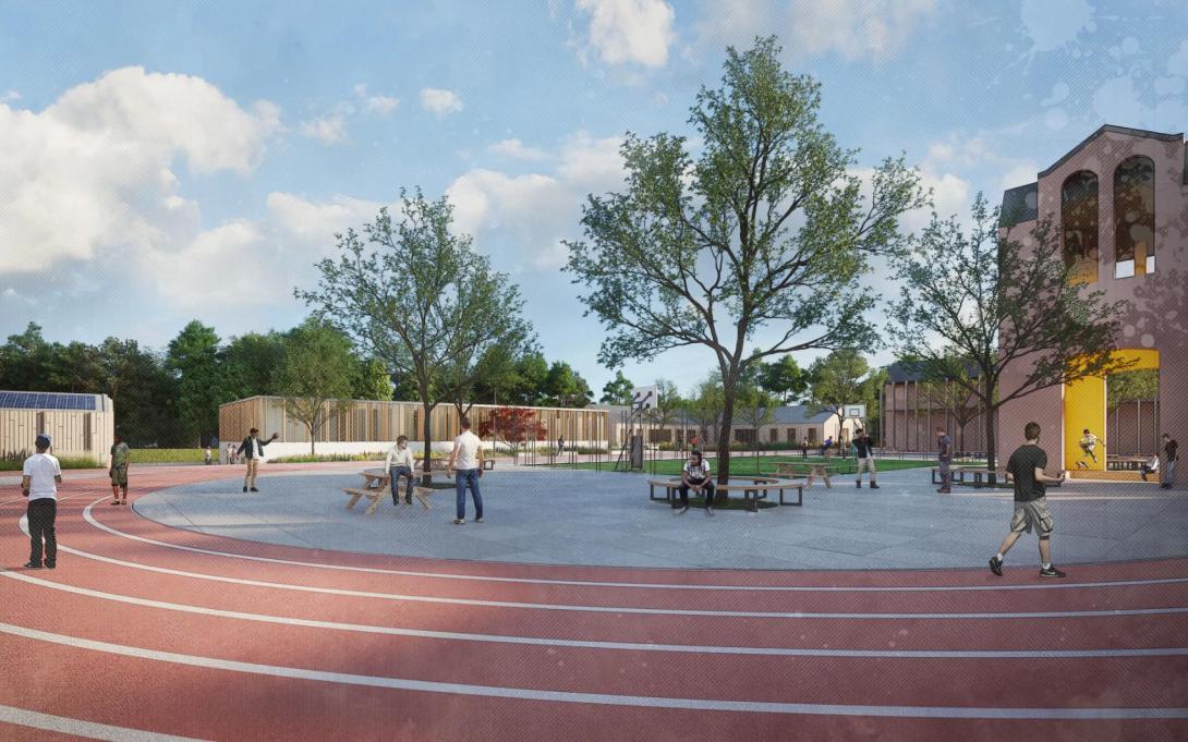 Het landschapsontwerp vormt een dragende laag onder de architectuur. Waar de oude campusstructuur steunde op binnenkoeren en harde grenzen, kiest het nieuwe concept voor een doorlopend groennetwerk waarin de gebouwen als objecten in een groen tapijt zijn opgenomen. Het centrale plein fungeert als scharnier tussen wonen, leren en sporten en biedt ruimte aan verschillende sferen: open zones voor gezamenlijke activiteiten, meer besloten tuinen bij de leefgroepen en functionele sportzones. Hoogteverschillen, beplanting en volumepositionering verzachten de overgangen tussen open en besloten ruimtes en creëren gradaties in privacy en toezicht.