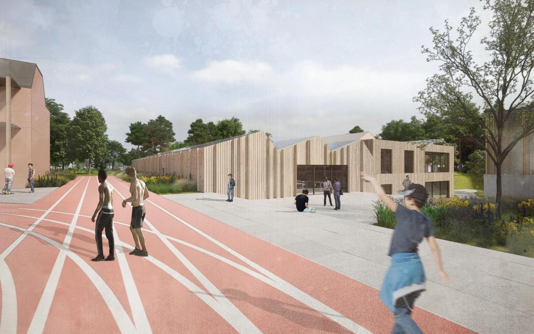 De volumetrie van de nieuwbouw draagt sterk bij aan de leesbaarheid van de campus. De sporthal manifesteert zich als een robuust en compact volume met geïntegreerde sporthal, fitness en dojo, logisch georganiseerd met korte en overzichtelijke circulatie. Het praktijk- en onderwijsgebouw wordt opgevat als een langgerekt volume met sheddaken waarin ateliers voor hout- en metaalbewerking, horecafuncties en theorielokalen onder één herkenbaar profiel zijn samengebracht. De woongebouwen hebben een meer huiselijke schaal en zijn kleinschalig geschakeerd. Door hun positionering rond het plein versterken ze het campusschema zonder een institutioneel karakter op te roepen. De lagere bouwhoogte van sport- en onderwijsgebouwen ten opzichte van de bestaande bebouwing bewaart zichtlijnen naar het landschap en het centrale plein.