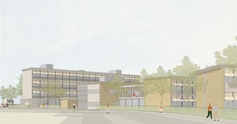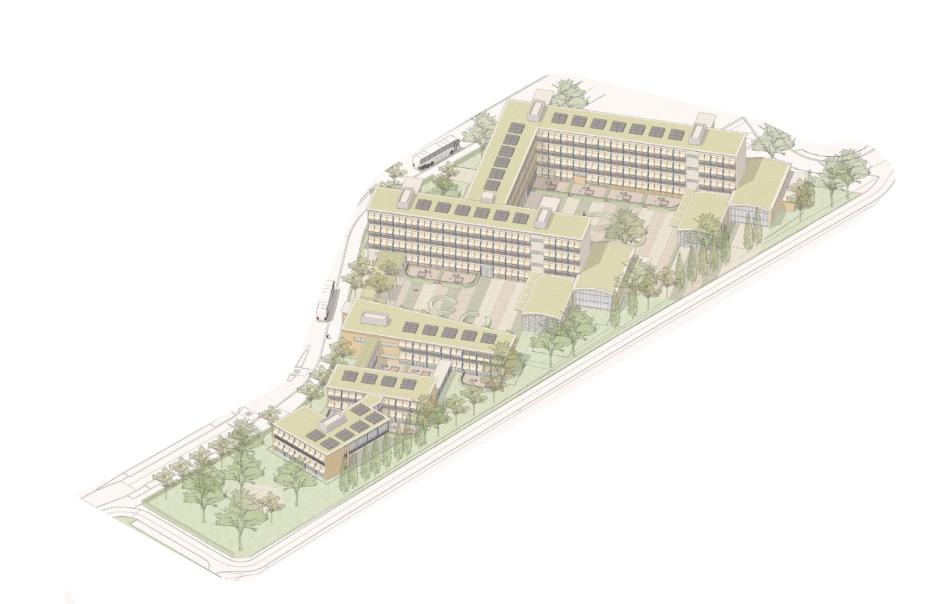 De hoofddraagstructuur blijft behouden, wat materiaal- en CO₂-besparing oplevert ten opzichte van nieuwbouw. Niet-dragende wanden worden selectief aangepast om flexibele klasclusters en zorglokalen te creëren. De gebouwschil wordt hoogperformant geïsoleerd, daken worden vernieuwd en geschikt gemaakt voor zonnepanelen, en technieken worden geüpdatet met aandacht voor ventilatie met warmterecuperatie, energiezuinige verwarming en performante zonwering. Zo bereikt het complex quasi-nieuwbouwniveau binnen de grenzen van renovatie.