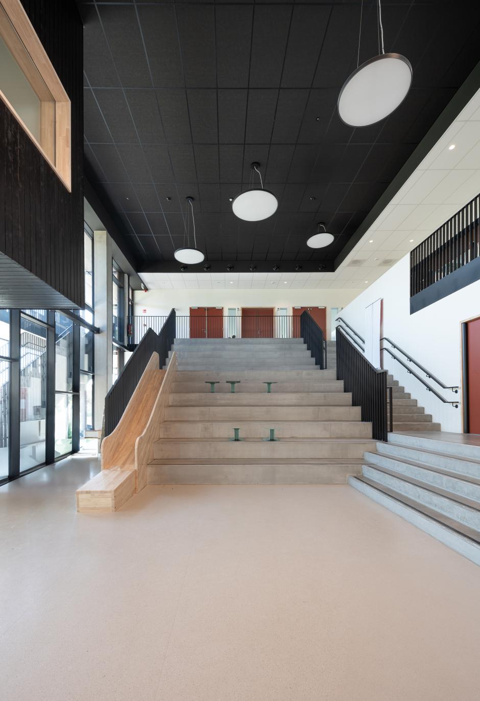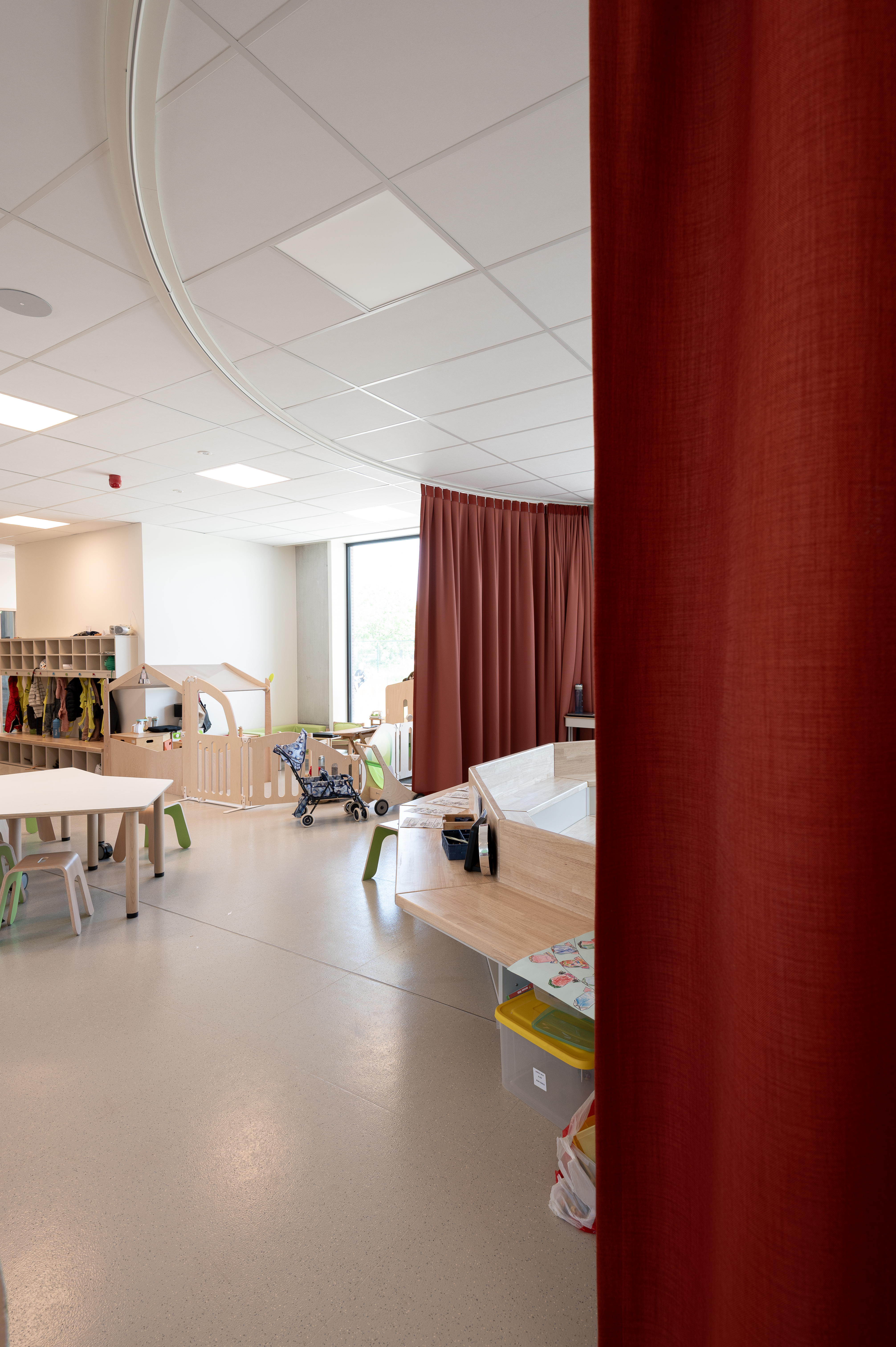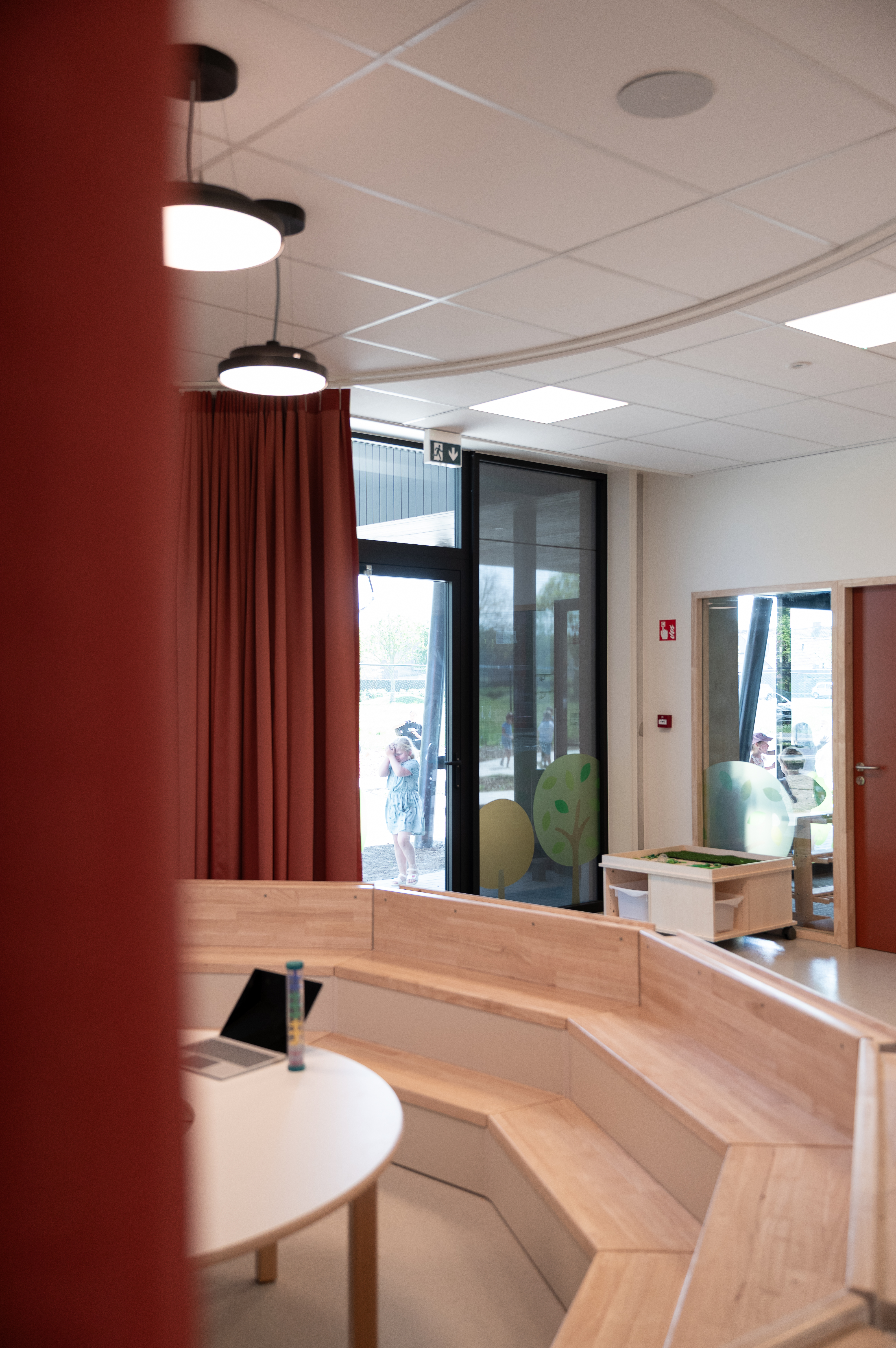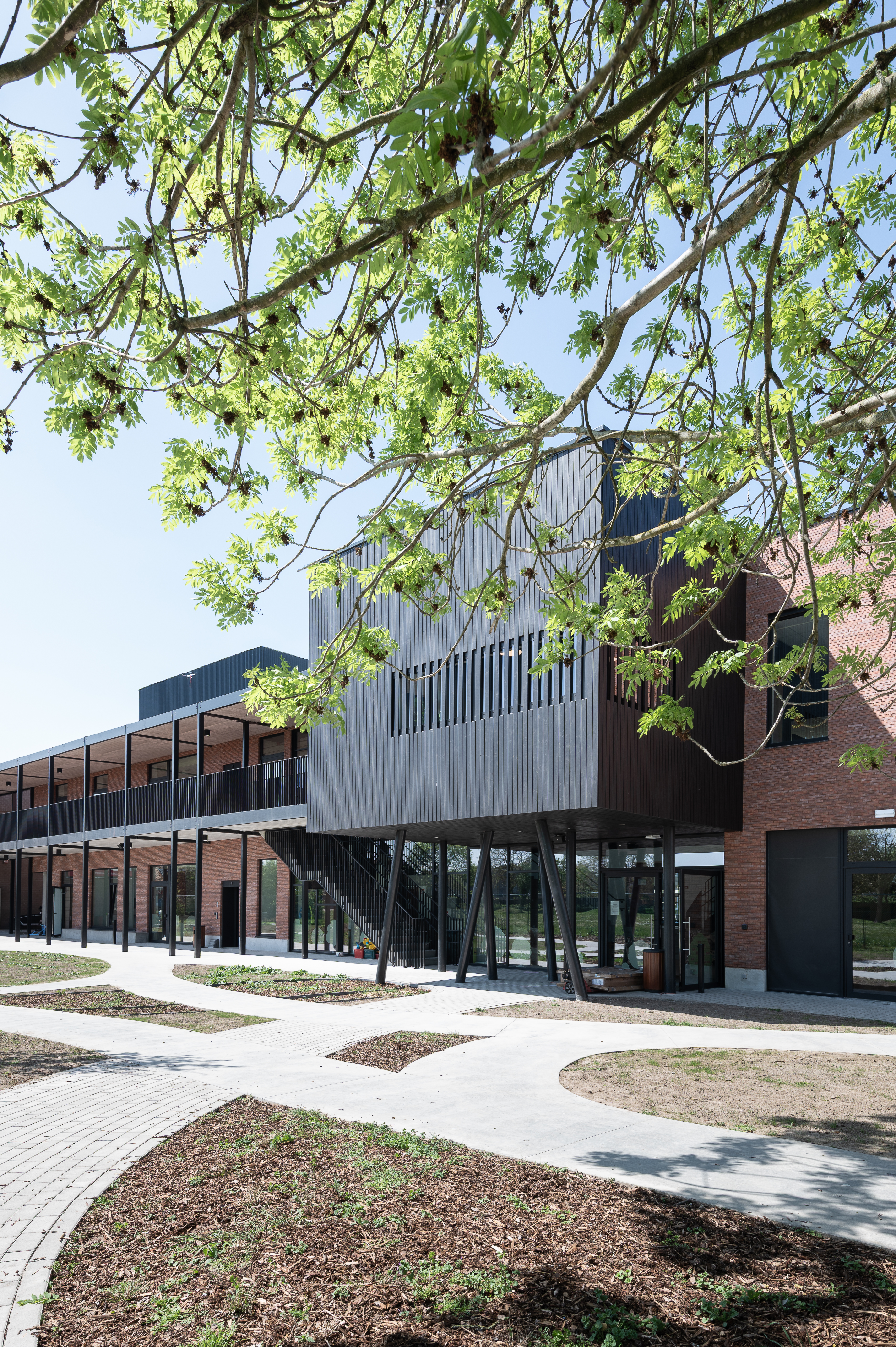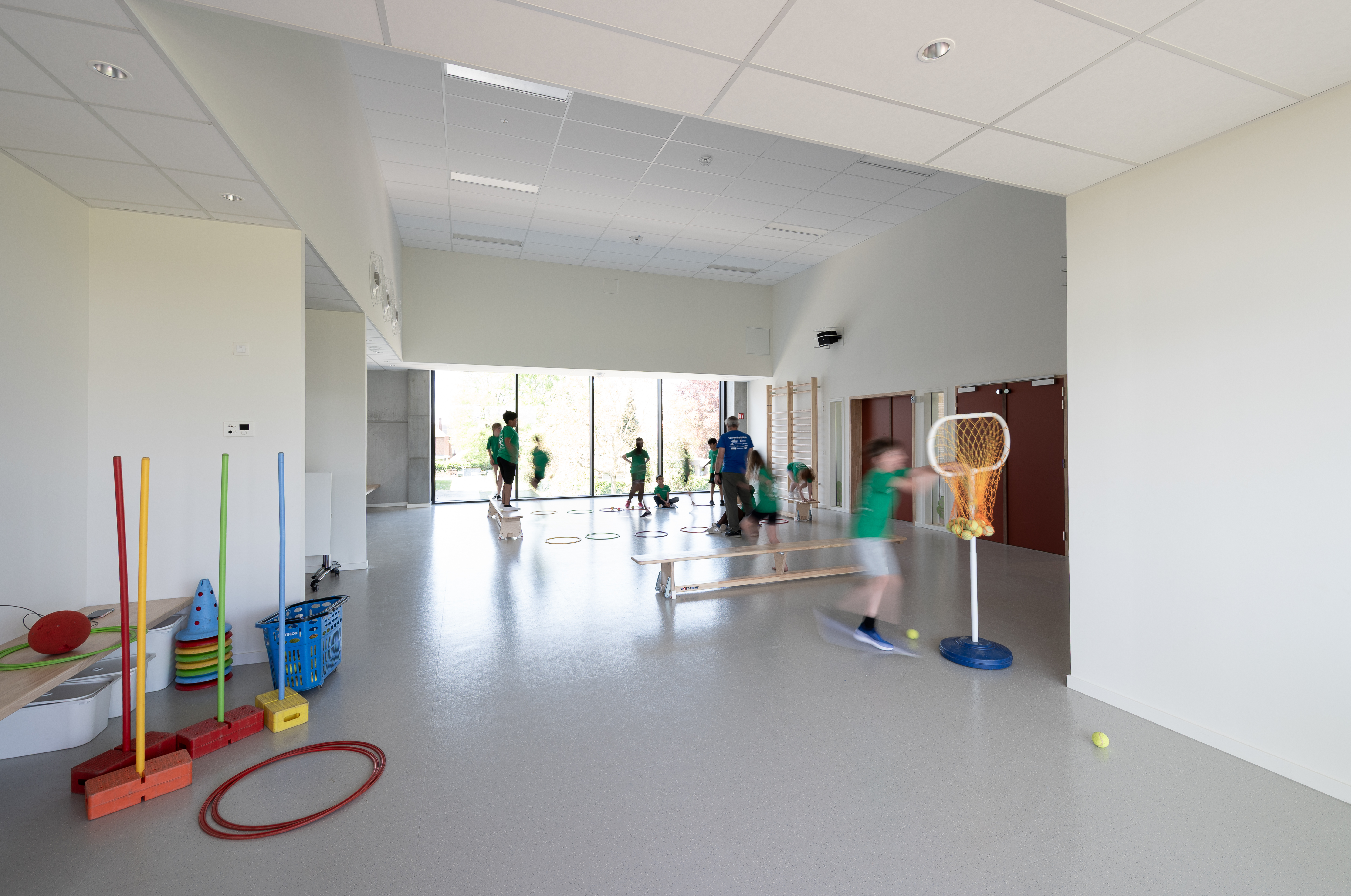 Het ontwerp zorgt voor een harmonieuze integratie van de uitbreiding in de bestaande schoolomgeving. De bouw gebeurde zonder de dagelijkse werking van de school te verstoren. Materialen en indeling dragen bij aan een aangename, gezonde en toekomstgerichte leeromgeving. Buitenruimtes zijn overdekt en veilig verbonden met de rest van de school via beschutte circulatie, zodat zowel kleuters als lagere schoolkinderen optimaal kunnen bewegen en spelen.