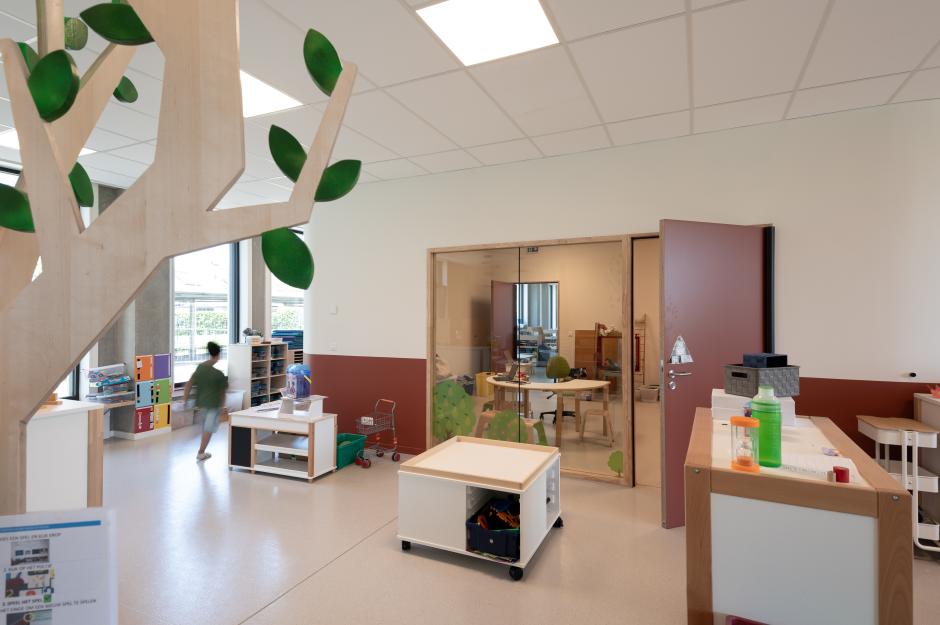 De uitbreiding omvat een nieuwe kleutervleugel van 1.150 m², ontworpen door AVDK Architecten. Een centraal atrium vormt het hart van het gebouw en verbindt verschillende leerzones en speelruimtes. In het kleuterlandschap zijn aparte zones en kringen voorzien, terwijl de trap van het atrium als tribune kan dienen bij groepsactiviteiten. Een opvallend element is de ‘boomhut’, die dienstdoet als leraarskamer en het onthaal accentueert. De turnzaal op de verdieping kan betrokken worden bij evenementen en andere activiteiten, waardoor de ruimte multifunctioneel inzetbaar is.